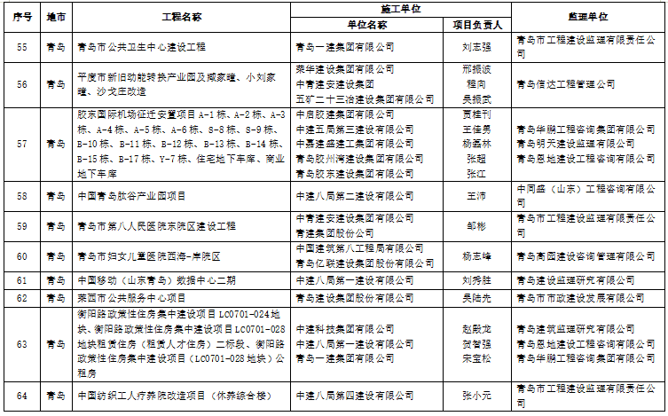 22 | 青岛 | 长江路道路整治工程(工程总承包) | 青岛西海岸市政工程有限公司 | 刘建忠 | 青岛信达工程管理有限公司 |