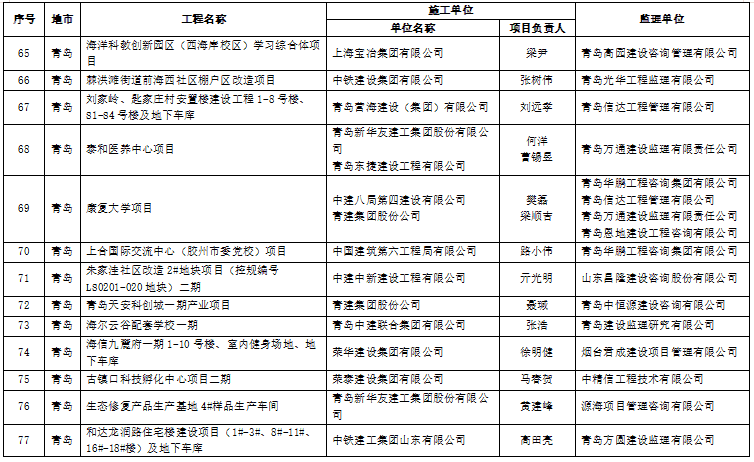 20 | 青岛 | 双创小镇(园区)基础设施配套工程 | 中建新疆建工(集团)有限公司 | 杨佳园 | 青岛华鹏工程咨询集团有限公司 |