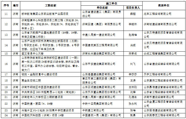 12 | 济南 | 济南国际医学科学中心南北三号路(清河南路至次横四路)道路建设工程 | 中建八局第二建设有限公司 | 吴传世 | 济南齐鲁建设项目管理有限责任公司 |