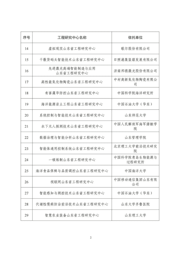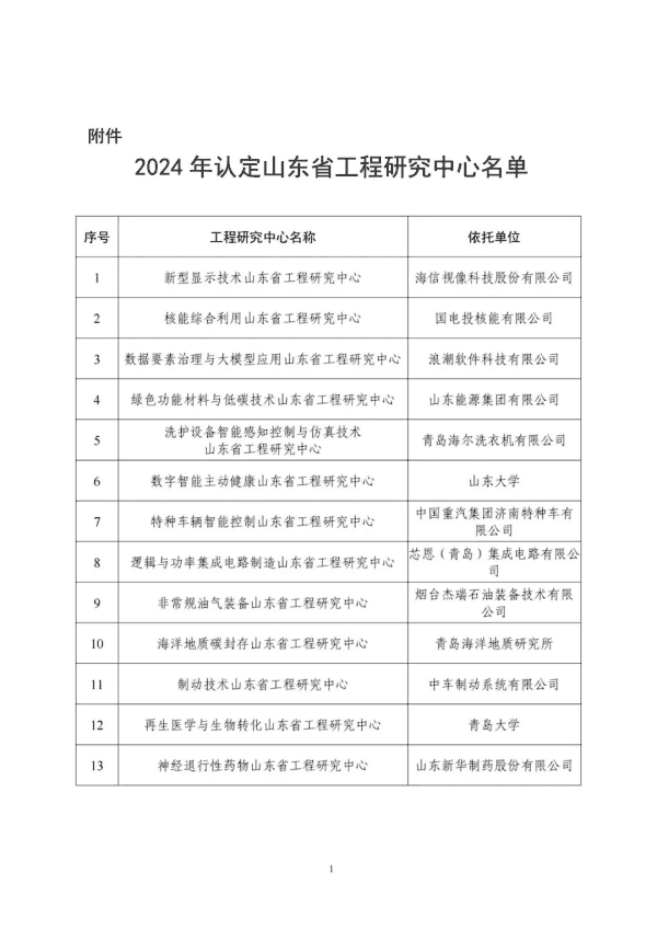 为深入实施创新驱动发展战略,加快提升综合创新能力,强化关键共性技术供给,以科技创新推动产业创新,培育形成新质生产力,根据《山东省工程研究中心管理办法》有关规定,经评审论证,认定海信视像科技股份有限公司新型显示技术工程研究中心等161家工程研究中心为山东省工程研究中心,现予以公布,并就有关事项通知如下。