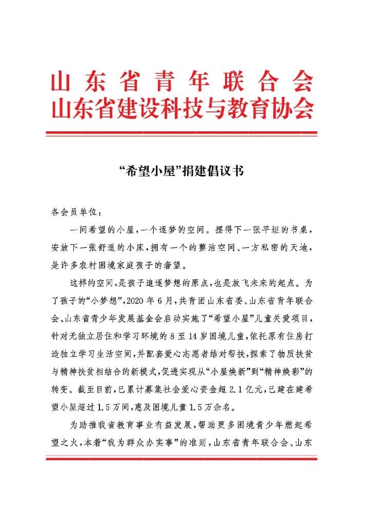 "希望小屋"捐建倡议书
