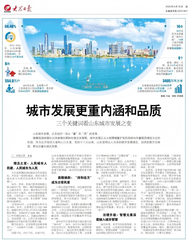 随着我国城镇化从快速增长期转向稳定发展期,城市发展正从大规模增量扩张阶段转向存量提质增效为主的阶段。作为北方经济大省和人口大省,党的十八大以来,山东坚持以人为本的城市发展理念,加快发展方式转型,更加注重内涵式发展。