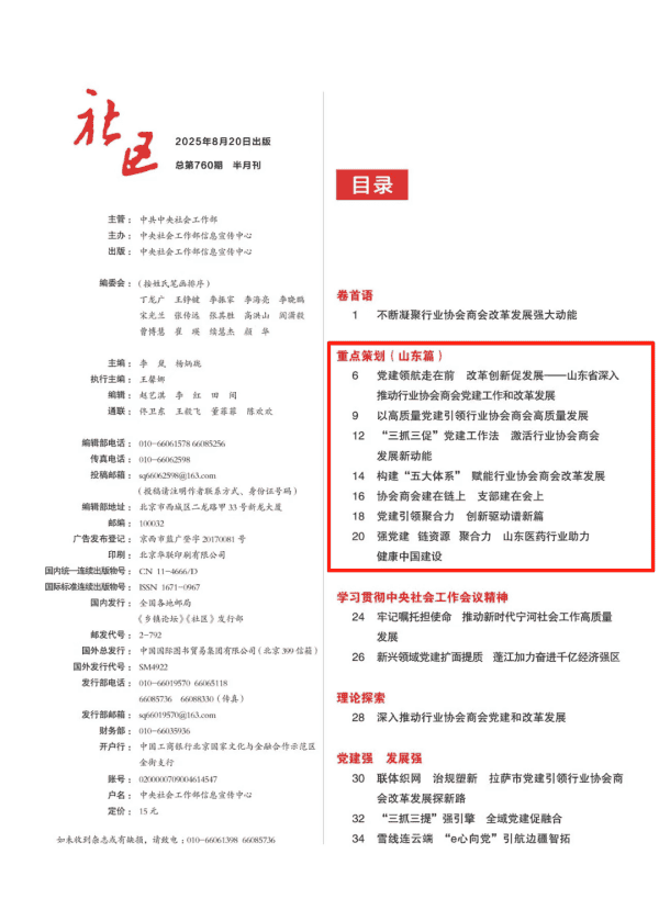 行业协会商会是连接政府、市场与社会的桥梁纽带。党的二十届三中全会提出“健全社会治理体系”“深化行业协会商会改革”,中央社会工作会议强调“继续抓好行业协会商会党建和改革发展”,为行业协会商会改革发展赋予了新的时代内涵和历史重任。本期特别报道聚焦山东省落实党中央决策部署,深入推动行业协会商会党建工作和改革发展的经验做法。