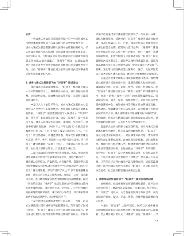中央城市工作会议在强调当前和今后一个时期城市工作的总体要求时提到“以坚持城市内涵式发展为主线”。城市内涵式发展是我国城镇化进程中的重要战略转向,标志着城市发展方式从规模扩张到品质提升的根本性变革。2023年6月,住房城乡建设部倪虹部长在中国城市高质量发展论坛上首次提出了“好房子”概念,也是结合房地产供求关系发生重大变化的新形势提出的关键性改革方向,当前“好房子”建设已成为推动住房城乡建设事业高质量发展的重要切入点。
