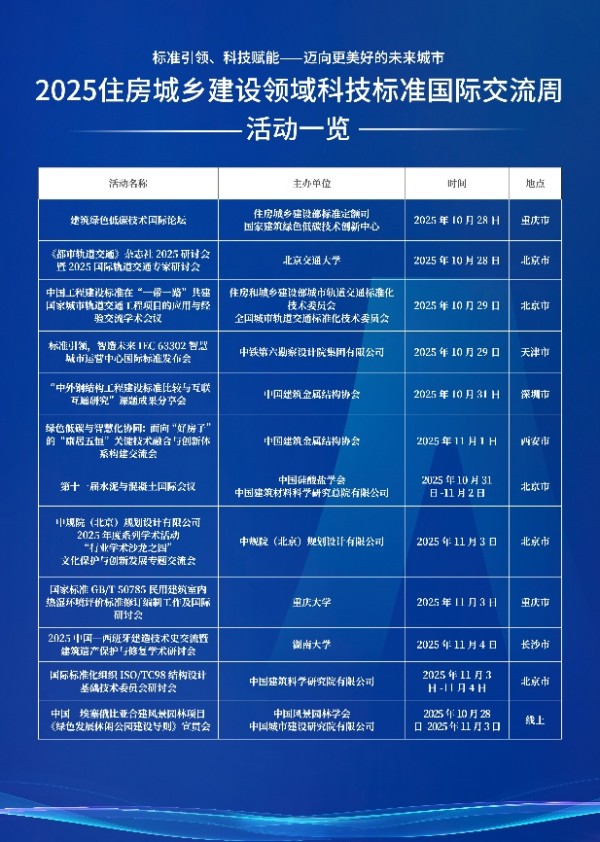 2025年10月28日至11月3日,由住房城乡建设部标准定额司主办的“2025年住房城乡建设领域科技标准国际交流周”(以下简称“交流周”)顺利开展。交流周以“标准引领、科技赋能——迈向更美好的未来城市”为主题,组织相关单位,举行了12场形式多样、内容丰富的交流活动。